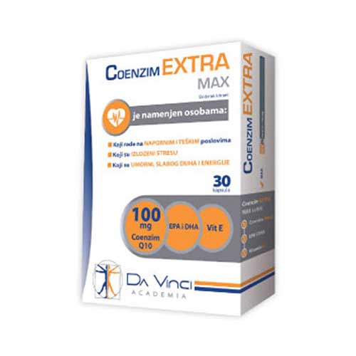 - Koenzim Extra Max je dodatak prehrani koji sadrži koenzim Q10 (100 mg), omega-3, vitamin E i vitamin B1.